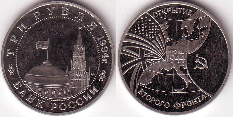 Dritto: La cupola del Mausoleo di Lenin e la torre del Salvatore, lungo le mura del Cremlino, occupano il centro del dritto, racchiusi in un cerchio di perle. A destra della torre, in basso, vi è il monogramma della zecca di Mosca. Lungo il bordo superiore, vi è l’iscrizione russa “Tre Rubli anno 1994”. Nel bordo inferiore è invece scritto “Banca Russa”. Le due iscrizioni nel bordo sono separate da due decorazioni a rombi.
