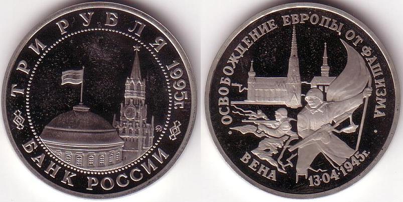 Dritto: La cupola del Mausoleo di Lenin e la torre del Salvatore, lungo le mura del Cremlino, occupano il centro del dritto, racchiusi in un cerchio di perle. A destra della torre, in basso, vi è il monogramma della zecca di Mosca. Lungo il bordo superiore, vi è l’iscrizione russa “Tre Rubli anno 1995”. Nel bordo inferiore è invece scritto “Banca Russa”. Le due iscrizioni nel bordo sono separate da due decorazioni a rombi.