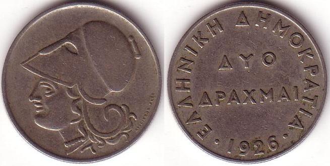 Rovescio: Al centro vi è il nominale “Due / Dracme” e nel bordo l’iscrizione "Repubblica Greca", separata dalla data 1926 da due perle.
