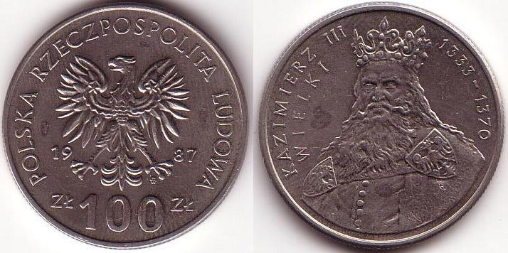 D/ Al centro vi è lo stemma di Stato, costituito dall’aquila volta a sinistra, che divide in due la data. In basso, il numero 100 del valore tra le sigle “ZL” a destra e a sinistra. Lungo il bordo, il nome ufficiale dello Stato “- POLSKA RZECZPOSPOLITA LUDOWA -”. Sotto la zampa destra dell’aquila si trova il monogramma della zecca di Varsavia.