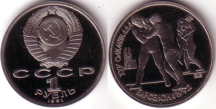 Rovescio: Al centro vi è una coppia di lottatori; sullo sfondo a destra c’è un’altra coppia di lottatori dell’antica Grecia, sotto le cui gambe appare una decorazione di gusto ellenistico. A sinistra vi è la Sagrada Famiglia, la famosa chiesa di Barcellona progettata da Gaudì. Lungo il bordo sinistro vi è la scritta in cirillico “XXV Olimpiade” e nel bordo in basso l’iscrizione “Barcellona 1992”, che si riferiscono alla 25° edizione delle Olimpiadi estive, tenutasi a Barcellona nel 1992. E’ interessante notare il confronto tra la disciplina olimpica moderna in primo piano e il suo corrispondente dell’antichità sullo sfondo del rovescio.
