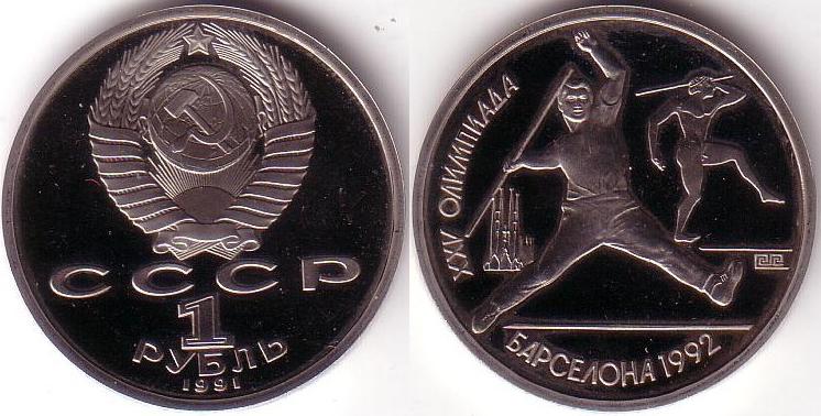 Dritto: In alto al centro vi è lo stemma dell’Unione Sovietica costituito dalla falce e il martello sovrapposti alla Terra che, insieme al sole nascente, è racchiusa fra due fasci di spighe. In basso lo stemma è chiuso da un carteggio, mentre in alto culmina in una stella a cinque punte. Sotto lo stemma, la scritta in cirillico “CCCP” che nell’alfabeto latino corrisponde alla sigla S.S.S.R. e che è formata dalle iniziali del nome ufficiale dell’Unione Sovietica. Più in basso vi è il valore “1 / Rublo” e sotto la data 1991.