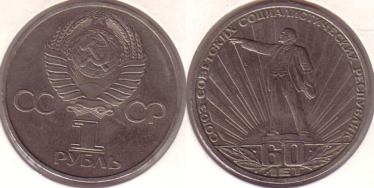 R/ Lenin in piedi davanti al sole che sorge. In esergo l’indicazione “60 anni” in russo fra allori, a ricordo del 60° anniversario della nascita della Repubblica Federale Sovietica Russa (che nel 1924 diverrà poi l’Unione Sovietica). Lungo il bordo superiore, la scritta che significa “Unione delle Repubbliche Socialiste Sovietiche”.
