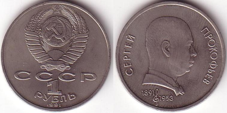R/ Il rovescio è dedicato al 100° anniversario della nascita del musicista russo Sergei Prokofiev. Al centro, il suo profilo destro e ai lati, lungo il bordo, il suo nome in russo. In basso, le date di nascita e di morte “1891” e “1953” separate da una chiave di violino.