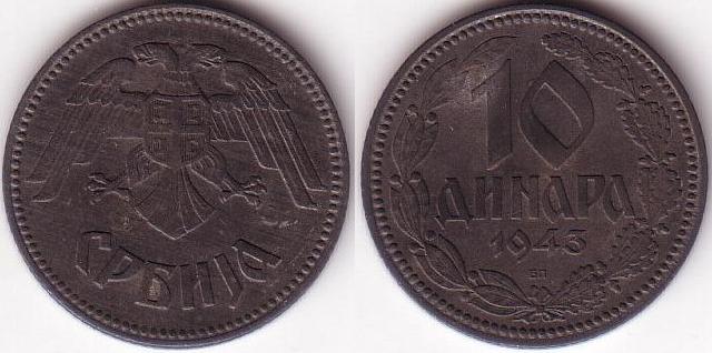 Rovescio: Il nominale “10 / Dinari” in cirillico, la data “1943” e l’indicazione della zecca di Budapest sono posti tra rami d’alloro e quercia. Bordo perlinato.