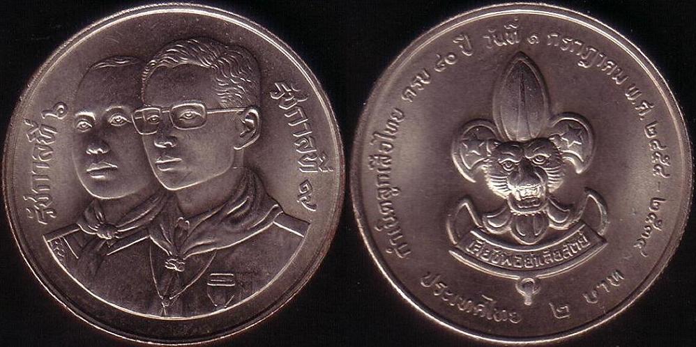 Rovescio: Al centro, lo stemma degli scout thailandesi. Lungo il bordo basso, la scritta “Thailandia” e il nominale in lingua thai. Nella legenda, sulla destra, le due date “2454 – 2534” espresse secondo il calendario buddista, che ricordano l’80° anniversario dei Boy Scouts in Siam.