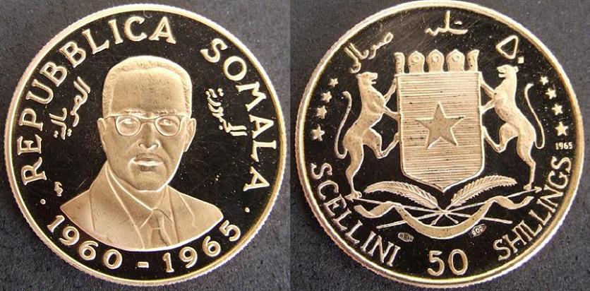 ROVESCIO : Al centro lo stemma della nuova Repubblica Somala, con ai lati dei leoni 4 stelle. Sotto lo stemma il valore della moneta, a sinistra "SCELLINI" e a destra "SHILLINGS". In alto in arabo 50 Scellini Somali. A destra, molto piccolo si legge l'anno 1965, appena sotto le stelle.