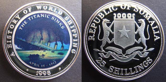 ROVESCIO : Moneta multicolore. Nel cerchio centrale è raffigurato l'affondamento del Titanic. Sotto si legge la data "APRIL 15 1912" ed attorno nella parte alta "THE TITANIC SINKS". Nell'anello esterno,