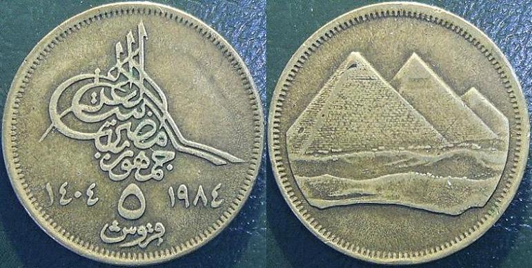 Dritto: Toughra della Repubblica Araba di Egitto. In basso, il nominale fra le due date: a sinistra “1404” riferita all’era islamica e a destra “1984” riferita al calendario cristiano. Bordo dentellato.