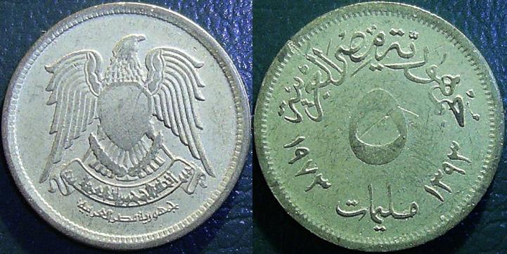 Rovescio: Il nominale “5 / milliemes” è al centro, fra le date “1973” e “1393” espresse secondo il calendario cristiano e islamico. In alto, la leggenda “Repubblica Araba d’Egitto”. Bordo dentellato.