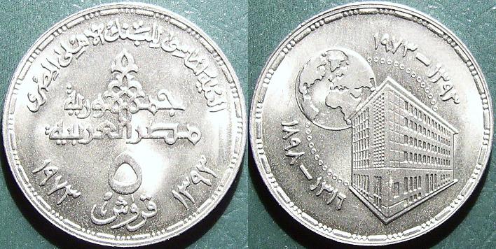 Rovescio: L’edificio della Banca Nazionale Egiziana, di cui la moneta ricorda il 75° anniversario, è in primo piano con il pianeta Terra sullo sfondo. Lungo il bordo le due coppie di date che ricordano l’anniversario nei due calendari. Il bordo è decorato da una successione di punti e linee.