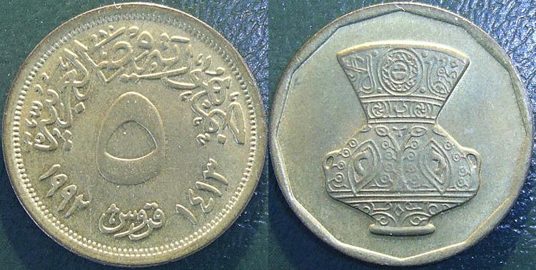 Dritto: Il valore è al centro. Nel bordo, in alto, “Repubblica Araba d’Egitto” e in basso le due date “1992” e “1413” nel calendario cristiano e islamico. Il bordo è dentellato.