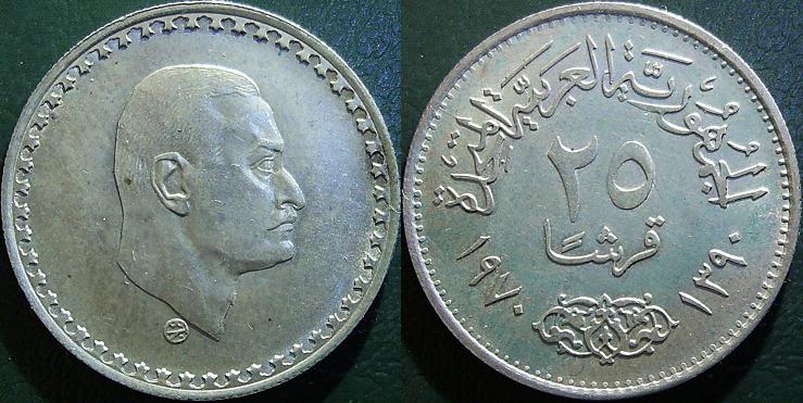 Rovescio: In alto, nel giro, appare l’iscrizione che significa “Repubblica Araba Unita”, la realtà politica fondata nel 1958 dal presidente egiziano Nasser e che comprendeva Egitto, Siria e Yemen. Nel giro basso vi è invece un’elegante decorazione, comune a diverse monete egiziane. Ai lati, la data 1970, riferita all’Era Cristiana, e 1390, facente riferimento al calendario islamico. Al centro, il nominale “25 / Piastre” in arabo. Il bordo è dentellato.