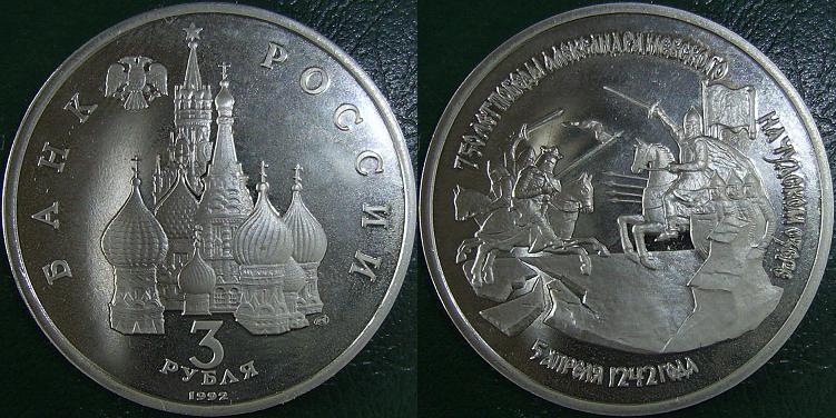 Dritto: Al centro vi è la Cattedrale di San Basilio a Mosca (in russo Chram Vasilja Blazennogo) sulla Piazza Rossa. Venne costruita tra il 1555 e il 1560 per celebrare la vittoria russa sui Mongoli, conseguita da Ivan IV il Terribile nella battaglia di Kazan (1552). Sullo sfondo, la Torre del Redentore, costruita lungo il muro che circonda il Cremlino (vd. Foto 1). Nel giro superiore, “Banca della Russia” e in basso il valore e la data “3 / Rubli / 1992”. In alto a sinistra lo stemma russo, riadottato dopo la dissoluzione dell’Unione Sovietica, risalente a Ivan il Grande e costituito da un’aquila bizantina a due teste. In basso a destra, il marchio della zecca di Leningrado.