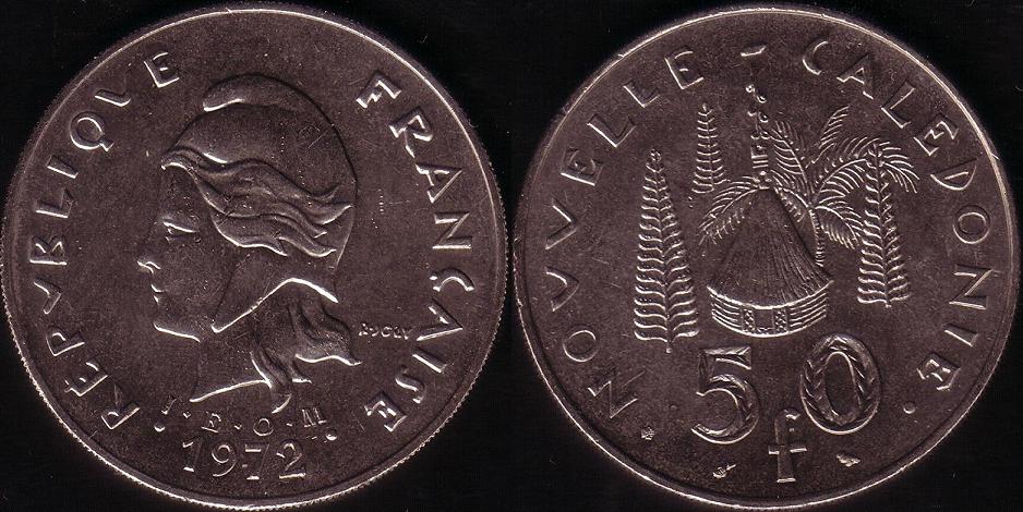 Rovescio: Al centro, capanna fra palme. In basso, il nominale “ 50 f ” fra una cornucopia, segno della zecca di Parigi, e un gufo, che indica il direttore della zecca Raymond Joly. Nel giro, “NOUVELLE CALEDONIE”. Bordo liscio.