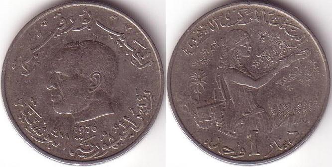 Rovescio: Figura femminile con una piantina in mano. Sullo sfondo, piantagione e trattore, rappresentazioni consuete delle emissioni FAO. In alto “Repubblica di Tunisia” e in basso il nominale “1 Dinar”. Sulla sinistra, in basso, il nome “ELMEKKI” dell’autore del conio. Bordo liscio.