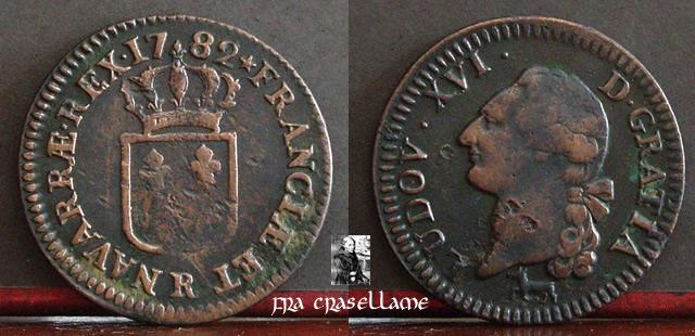 Descrizione: Testa di Luigi XVI a sinistra, i capelli annodati sulla nuca da un nastro. In basso, segno del maestro di zecca: un cane che corre a sinistra.