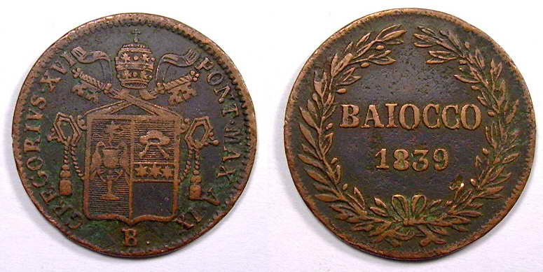 Dr.: Stemma, ornato e sormontato dalle chiavi e dalla tiara. Intorno: GREGORIVS XVI PONT. MAX. AN. IX. Sotto, B.