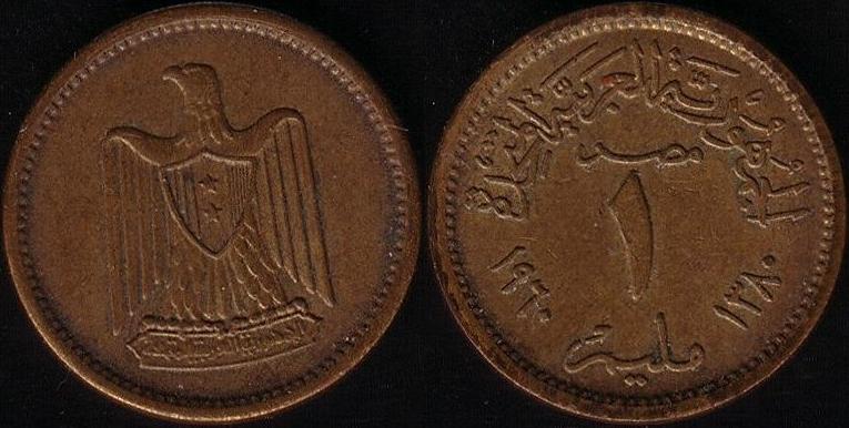 Rovescio: La cifra araba "1" del nominale al centro. In basso "Millieme" e in alto "Misr" che significa "Egitto". Nel bordo, le date "1960" e "1380" e la legenda "Repubblica Araba Unita". Bordo dentellato.