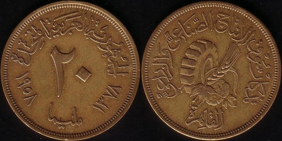 Dritto: Nel giro alto "Repubblica Araba Unita" e al centro il "20" del nominale. In basso "Milliemes" e ai lati le date "1958" e "1378". Bordo dentellato.