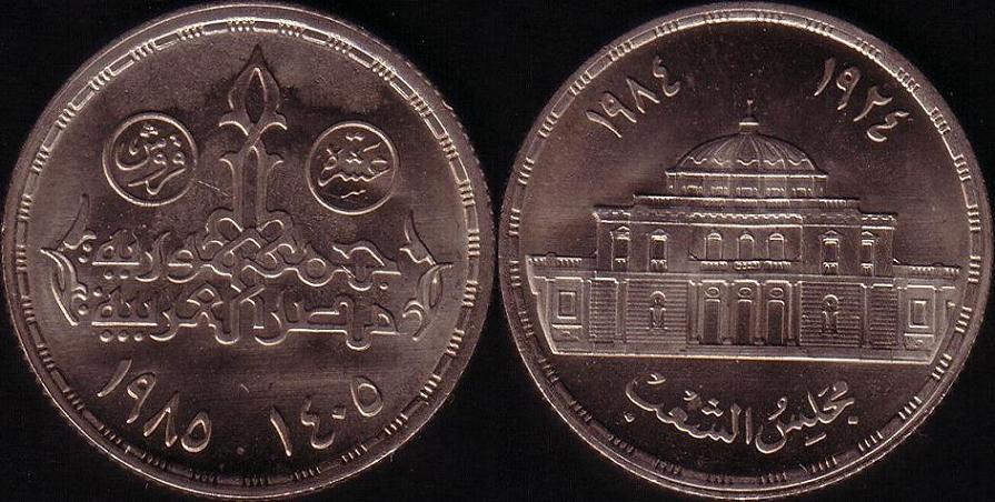 Dritto: Iscrizione araba al centro (Repubblica Araba d'Egitto?). Ai lati in due cerchi "Piastres" e "Dieci". In basso, le date "1985" e "1405". Bordo decorato.
