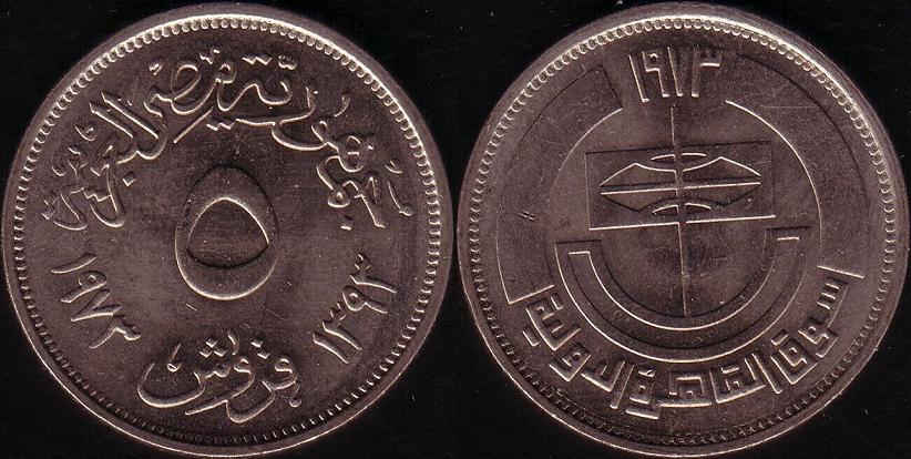 Dritto: In alto "Repubblica Araba d'Egitto", in basso "5 Piastres" tra le date "1973" e "1393". Bordo dentellato.