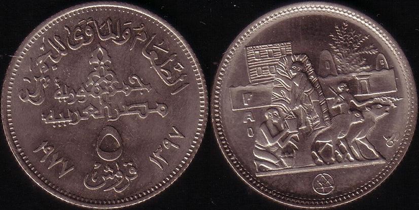 Dritto: In alto "Repubblica Araba d'Egitto", in basso "5 Piastres" sotto ad un ricamo e tra le date "1977" e "1397". Bordo dentellato.