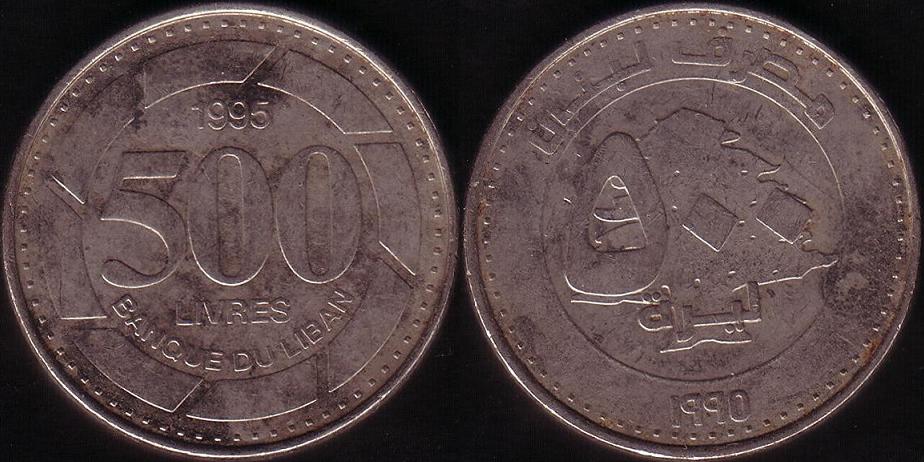 Dritto: Nominale “500 LIVRES” al centro. In alto, la data “1995” e in basso “BANQUE DU LIBAN”. Tutto intorno, cornice circolare. Bordo perlinato.