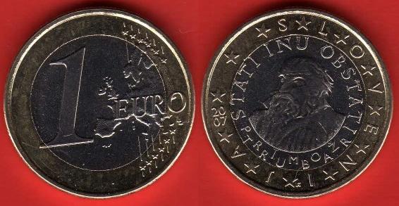 La moneta da un euro, presenta un ritratto di Primož Trubar (1508-1586), prete cattolico sloveno che si convertì al luteranesimo. Traducendo diverse parti della bibbia e scrivendo diverse opere di carattere religioso, pose le basi della letteratura slovena. Intorno al ritratto si legge il motto “Stati inu obstati” ovvero "rimanere saldi e fermi". Nel contorno appaiono le dodici stelle europee e la scritta "Slovenija". A sinistra si può leggere l'anno di conio.