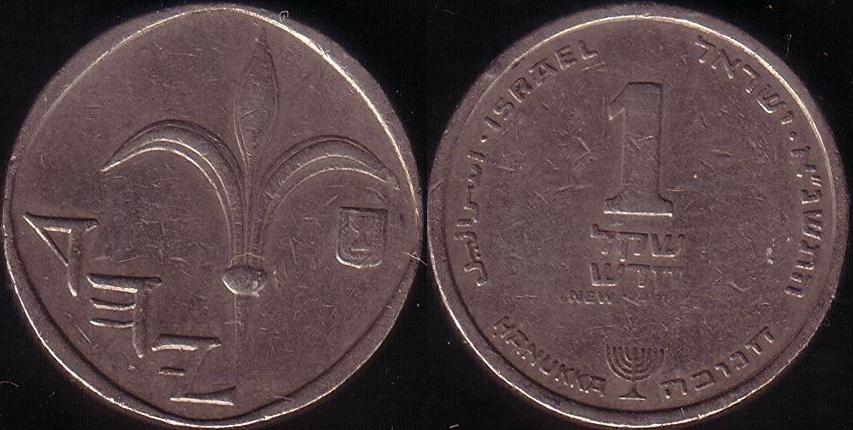 Rovescio: Il valore “1” e la scritta “New Sheqel” in ebraico e in inglese. Sul bordo la scritta “Israele” in ebraico, inglese e arabo, e la data. In basso, la scritta Hanukka in inglese e ebraico, separate dal menorah.