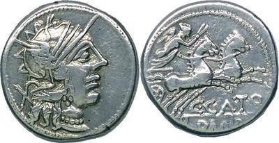 R/ Vittoria in biga al galoppo a destra, sotto C.CATO, in esergo ROMA