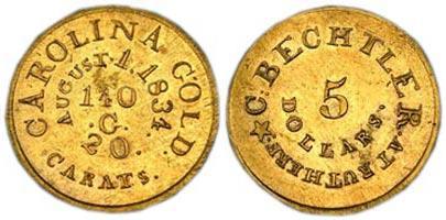 Così, nel luglio 1831, Christoph Bechtler si mise a coniare quarter e half eagles (2,50 e 5 dollari) e, alla fine dell'anno, creò una moneta del tutto nuova, il dollaro d'oro :) La prima coniazione ufficiale di questo nominale da parte della Zecca sarebbe avvenuta soltanto 18 anni più tardi, nel 1849.