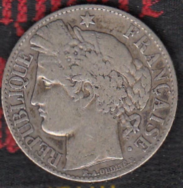 Moneta #1: France, 1-franc, 1887a, zecca Paris, tiratura 3,292,000, peso originale 5.00 grammi, argento .835, peso originale di argento .1342 ounce, prezzo di Krause c.2006....F (MB) $4.00.