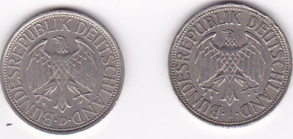 Salve a tutti, la moneta in questione è un comunissimo marco tedesco che il krause classifica con il codice 110 dal 1950 fino all'introduzione dell'euro. Mi sono però accorto che quelli del 1950 sono leggermente diversi da tutte le altre annate (non le ho proprio tutte ma ne ho viste diversi). Il carattere usato per le scritte sul retro è molto più "spesso" delle altre annate.