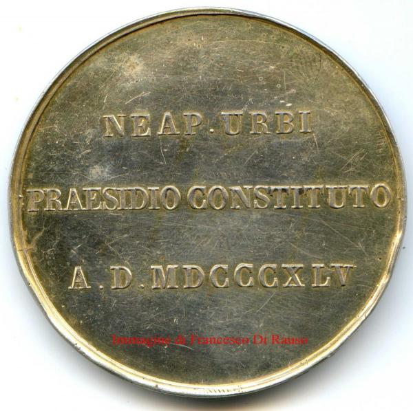 Nello stesso anno venne coniata una medaglia dai rilievi altissimi, essa è opera dell'incisore della zecca di Napoli Vincenzo Catenacci, il busto che vedete al dritto della medaglia è ripreso fedelmente dal colossale busto in argento conservato ancora oggi nel Museo del Tesoro di San Gennaro, un vero spettacolo, un'opera di rara bellezza! Al rovescio la leggenda recita della costruzione di un presidio e non della proclamazione a compatrono, il Ricciardi e il D'Auria (rif. 207) classificano la medaglia per la costruzione della caserma di Cavalleria nel quartiere di San Pasquale a Chiaia. Ogni vostro commento o segnalazione sulla costruzione di questa caserma è bene accetta. Magari tra voi c'è qualche napoletano di buona volontà che saprà dirci qualcosa in più. Grazie