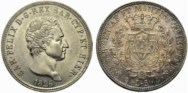 R/ DVX SAB GENVAE ET MONTISF PRINC PED & Scudo a cuore coronato ed inquartato con il collare dell' annunziata , tra due rami di quercia ; in basso il valore L. 5 tra segni di zecca