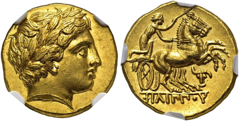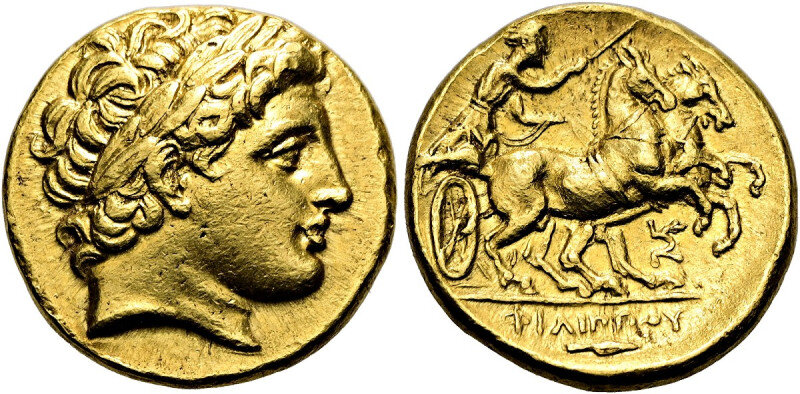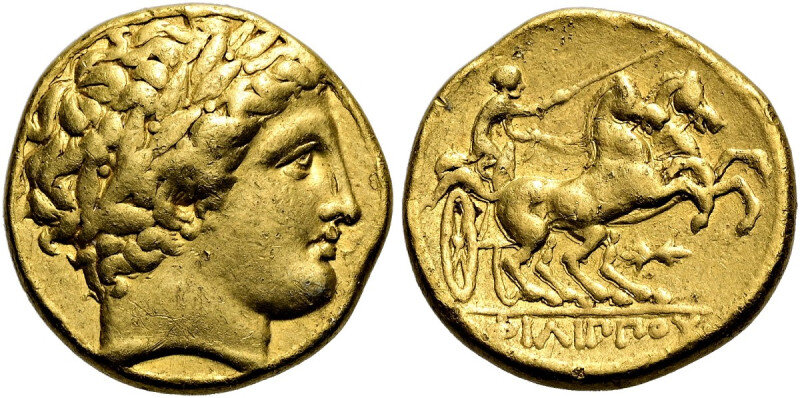 Lot 154. KINGS OF MACEDON. Philip II, 359-336 BC. Stater (Gold, 18 mm, 8.60 g, 4 h), Pella, circa 345-336. Laureate head of Apollo to right. Rev. ΦΙΛΙΠΠΟΥ Charioteer driving biga to right, holding reins in his left hand and goad in his right; above, cicada to right. Le Rider 45 (D23/R36). SNG ANS 128. Lustrous and fresh. Very light doubling, otherwise, virtually as struck.