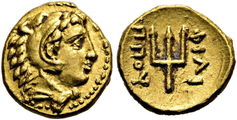 Philipp II., 359 - 336 v. Chr. Stater ø 18mm (8,50g). Mzst. Abydos, 323 - 317 v. Chr. Geprägt unter Leonnatos, Arrhidaios oder Antigonos II. Vs.: Apollonkopf mit Lorbeerkranz nach r. Rs.: ΦΙΛΙΠΠΟΥ, Wagenlenker steuert Biga n. r., darunter Ξ und ein weiteres Pferdebein. Mit diesem Beizeichen: Le Rider ­ ; SNG ANS 299 (stgl.); Thompson, ADM II Serie V 89 (stgl.).