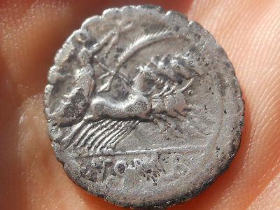 Comunque, è un denario (un po' malridotto, ma direi autentico) di Q.Antonius Balbus, 83-82 a.C., classificato da Crawford come RRC 364/1. La E-dot al D è una marcatura di conio. Al R il nome del monetiere è in esergo, in legatura.