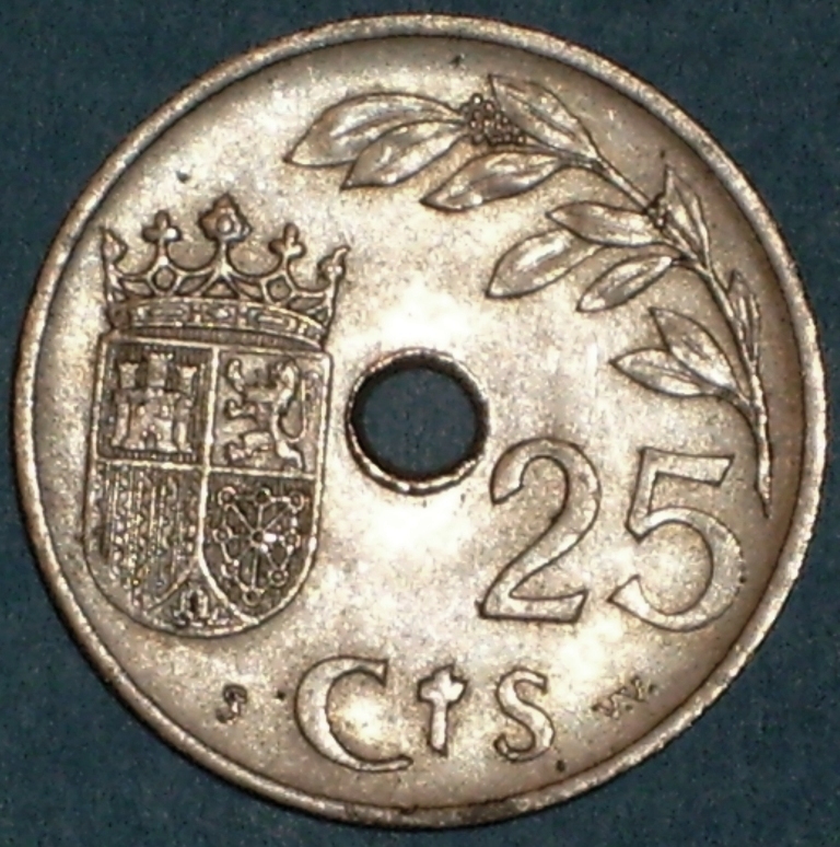 un'altra moneta di particolare propaganda è questa : 25 centimos 1937, Spagna, Governo nazionalista. La legenda recita "Espana- Una-Grande-Libre " che era il motto della Falange e "II° ano triunfal" riferito alla guerra civile ; a lato il simbolo della Falange (il giogo con le frecce)
