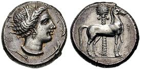 Per fattezze del cavallo ( mi sembra di notare gambe lunghe), e il volto verso destra al dritto, mi viene da pensare alla monetazione Campano-Cartaginese, sotto il dominio di Annibale, ma non trovo riscontri. <_<