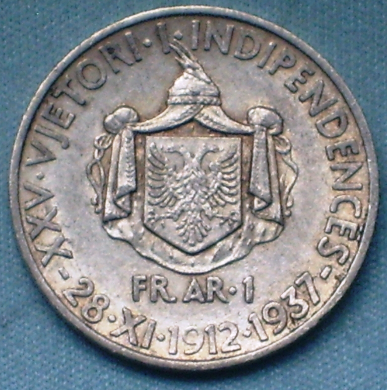 Partecipo a questa discussione con questa moneta, 1 frang ar 1937, commemorativa dell 25° anniversario dell'indipendenza dell'Albania