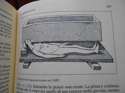 Alcune rarissime volte nella storia e nel corso di scavi archeologici , avvengono delle scoperte sensazionali , forse uniche , che se non fossero documentate tramite scritti , documenti , disegni , testimonianze , in antico e fotografate in epoca moderna , si stenterebbe a credere siano veramente avvenute . Nell' anno 1485 , il giorno 16 di Aprile , durante il pontificato di Papa Innocenzo VIII , nel corso di scavi nella Via Appia , circa 5 miglia fuori Porta Appia delle mura aureliane , fu trovato a circa 3,5 metri di profondita' , dentro il suo semplice sarcofago , il corpo intatto di una ragazza romana di eta' apparente intorno ai 20 anni . Di questo eccezionale ritrovamento esistono tre testimonianze scritte , dell' epoca , una di Antonio di Vaseli , di messer Daniele da San Sebastiano , presenti allo scavo e una carta proveniente dal Codice 716 della Biblioteca di Monaco , di cui ne trascrivo per motivi di spazio , di queste tre , una sola testimonianza di un testimone dei fatti , anche perché quanto scritto indipendentemente dai tre e' uguale nei particolari , cambiano solo le parole usate nel testo .