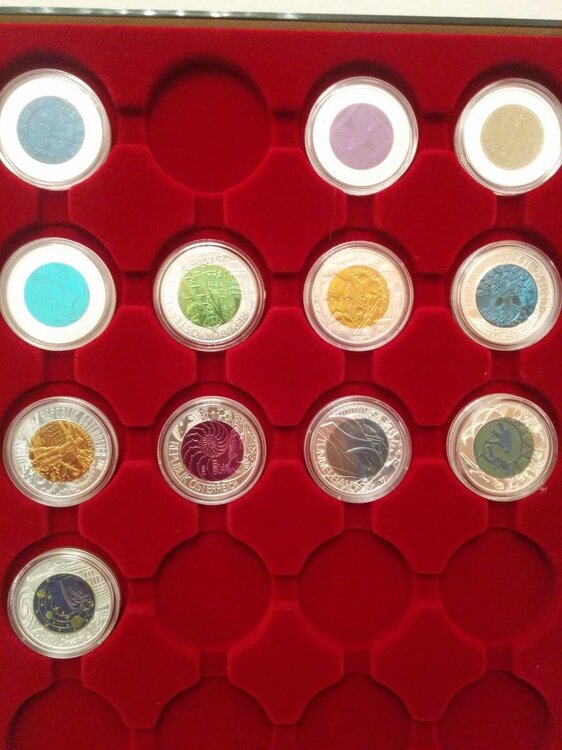 Ragazzi, rispolvero questa discussione per chiedere se qualcuno utilizza dei cofanetti per le monete da €25 argento/niobio austriache. Le monete sono ormai una buona quantità e la visione di insieme sarebbe spettacolare invece di aprire ogni singolo cofanetto per visualizzarle. Se qualcuno lo utilizza mi saprebbe indicare un cofanetto che si adatti perfettamente alla dimensione della moneta e capsula? Magari se avete qualche Vostra foto postatela. Grazie in anticipo.