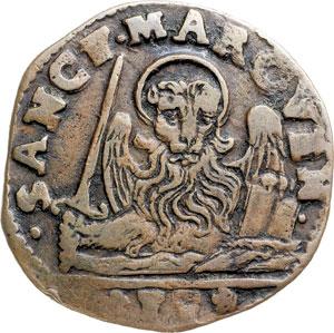 D: SANCT MARC VEN; mezzo busto del leone nimbato, posto di fronte su nubi, con la spada nella zampa destra ed il libro aperto nella sinistra. Nell'esergo II tra due rosette;