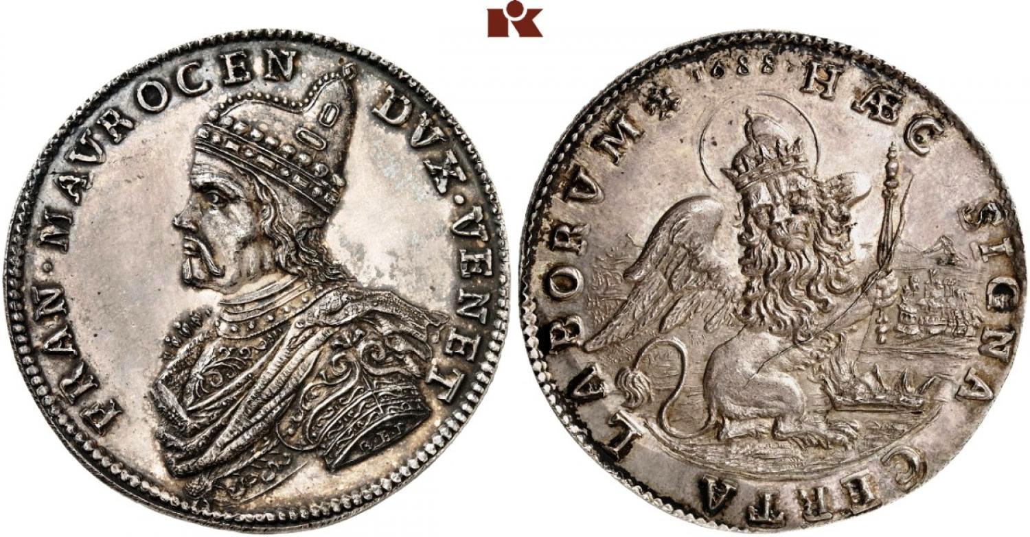 Rv. EX UTROQUE - VICTOR. Il Leone di San Marco, vittorioso, rampante verso s., brandisce una spada avvolta da ramo d’alloro e stringe un delfino, simbolo del dominio del mare; a terra, freccia ed arco spezzati.