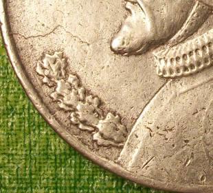 Non-magnetico e la corretta 38,1 mm di diametro, con il colore decente, questo pezzo—comunque—ha difetti di produzione che segnano come una contraffazione. Notare l'aspetto strano di metallo a sinistra del ritratto:
