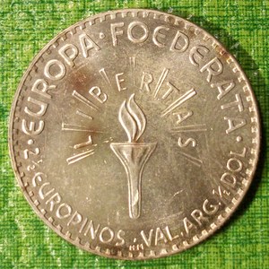 A silver fossil of Europe’s postwar movement toward economic and political union: a 1952 2½-europinos picturing General Eisenhower that was struck at Hamburg and was privately issued in the name of the “EUROPA FOEDERATA.”