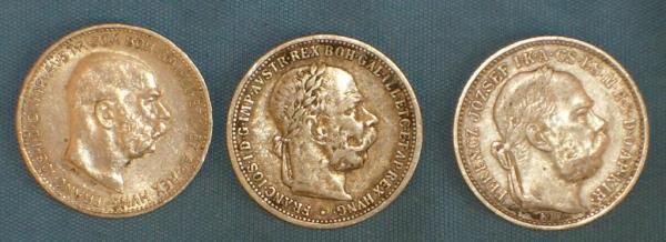 ieri mattina ho preso queste 3 monete d 1 corona, di cui una di conio ungherese e due di conio austriaco. Dal catalogo ho visto che sono in ag 835 e pesano 5 grammi ognuna, come le monete da 1 lira italiana dell'epoca.