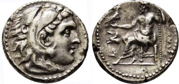 Kingdom of Macedon, Alexander III, The Great, AR Drachm, 3.59g., Lampsakos, 310-301 B.C., head of young Herakles right, wearing lion's skin, rev. [A]ËEANÄ[POY], Zeus enthroned left, holding eagle and sceptre, forepart of Pegasos above monogram to left (Price 1382 var.), extremely fine.